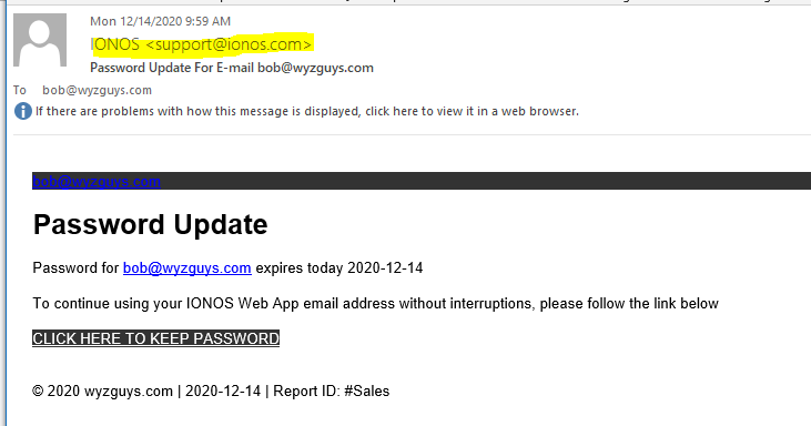 A quick check at VirusTotal.com showed the link in the email  https://login.ionos.es/verify?id=bob@wyzguys.com was “clean” but the link resolves to https://dictatecompact.com/js/vendor/home/.  VirusTotal reported this as a phishing link.  This is another example of obscuring a malicious link beneath a benign link.